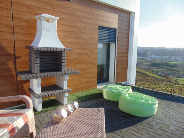 Churrasqueira em betão pintado de branco, com tijolo cinza, com 2 prateleiras