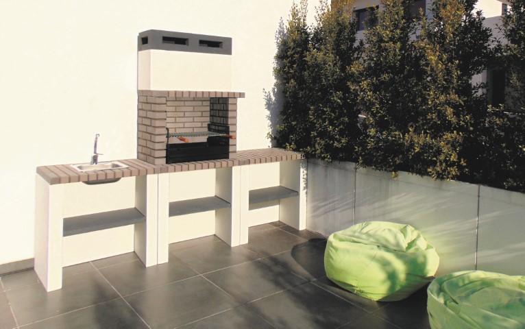 Churrasqueira em betão pintado de branco e preto e com tijolo cinza (incluí grelhador em ferro 60x40x30cm)