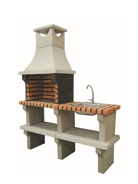 Churrasqueira em tijolo matizado, com lava-louça e torneira, com aro, bancadas inferiores, chaminé, fugas, laterais e pés em betão natural